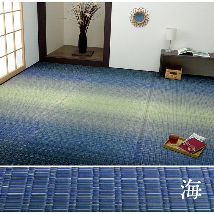 大きな目と小さな目を交互に織り込んだ、吸い込まれるような美しいグラデーションで雄大な草原と海を表現しました。天然素材のい草には、お部屋の空気をきれいにする空気清浄効果、お部屋の湿度を調整する調湿効果、汗臭、加齢臭、ペット臭などの嫌な臭いを消臭する消臭効果など優れた機能性があります。また抗菌防臭効果のあるヒバエッセンス加工をい草生地に施しています。