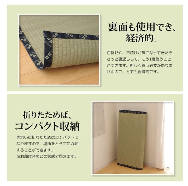 こちらの商品は畳表と同じ織り方の糸引織で仕上げています。表面が滑らかなので、ホコリなどがたまりにくいのが特徴です。天然素材のい草には、お部屋の空気をきれいにする空気清浄効果、お部屋の湿度を調整する調湿効果、汗臭、加齢臭、ペット臭などの嫌な臭いを消臭する消臭効果など優れた機能性があります。また抗菌防臭効果のあるヒバエッセンス加工をい草生地に施しています。