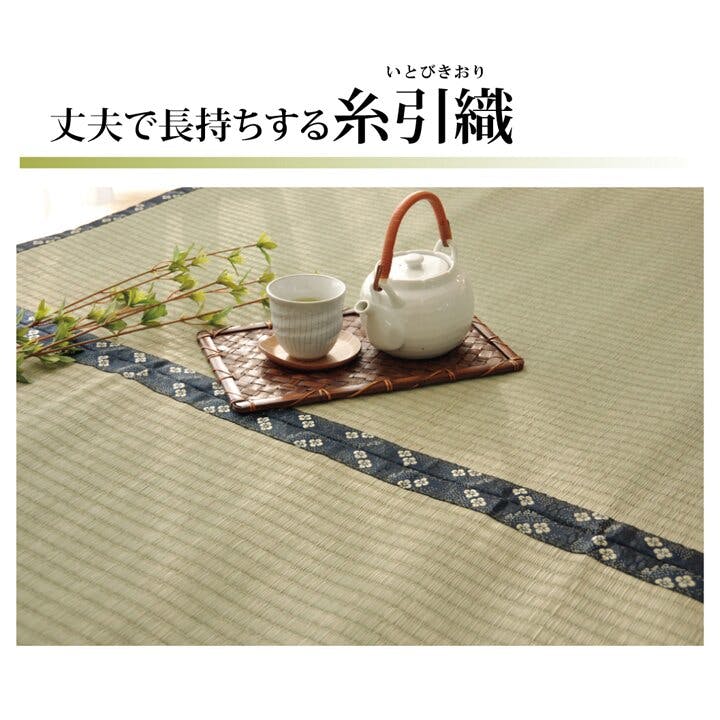 こちらの商品は畳表と同じ織り方の糸引織で仕上げています。表面が滑らかなので、ホコリなどがたまりにくいのが特徴です。天然素材のい草には、お部屋の空気をきれいにする空気清浄効果、お部屋の湿度を調整する調湿効果、汗臭、加齢臭、ペット臭などの嫌な臭いを消臭する消臭効果など優れた機能性があります。また抗菌防臭効果のあるヒバエッセンス加工をい草生地に施しています。