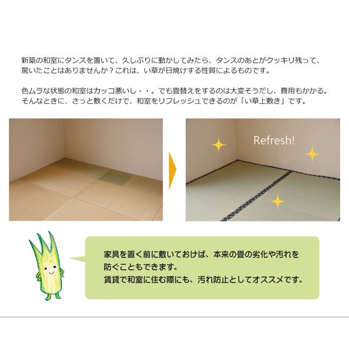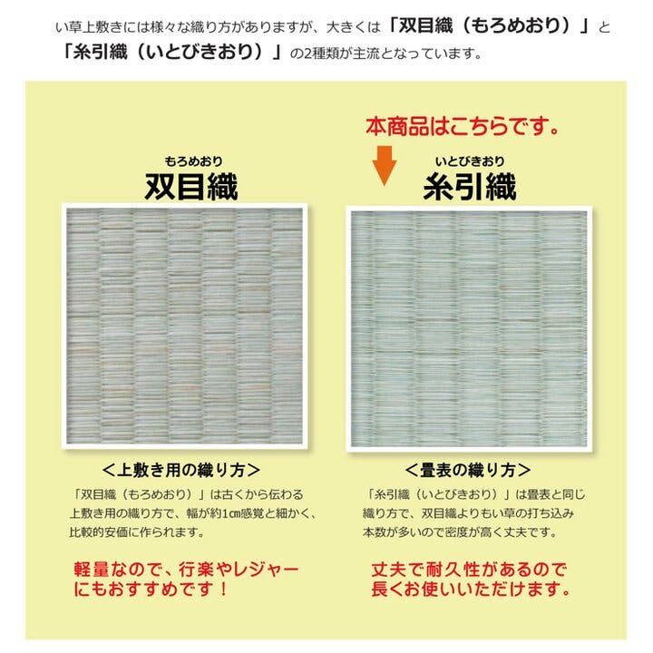 こちらの商品は畳表と同じ織り方の糸引織で仕上げています。表面が滑らかなので、ホコリなどがたまりにくいのが特徴です。天然素材のい草には、お部屋の空気をきれいにする空気清浄効果、お部屋の湿度を調整する調湿効果、汗臭、加齢臭、ペット臭などの嫌な臭いを消臭する消臭効果など優れた機能性があります。また抗菌防臭効果のあるヒバエッセンス加工をい草生地に施しています。