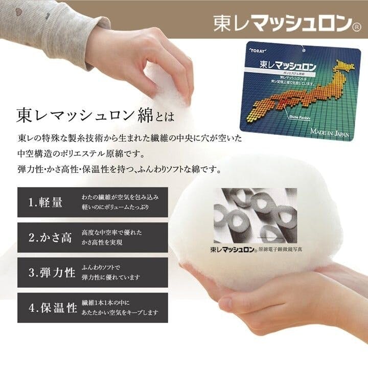 表地=ポリエステル100%【短毛マイクロ】 裏地=ポリエステル100%【ピーチスキン】 中綿=ポリエステル100% 2.2kg(東レ マッシュロンわた) 日本(側地=中国 最終加工=日本)