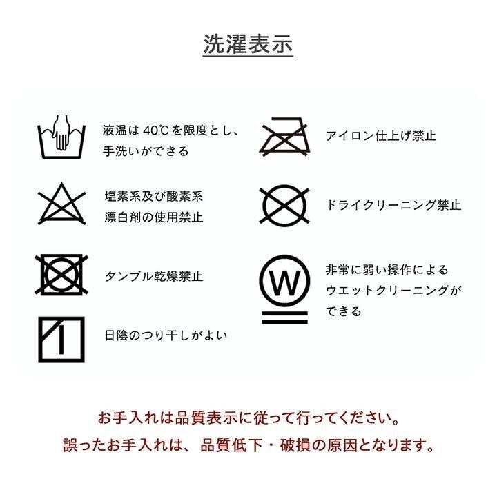 40℃以下の水温で弱い手洗いで洗濯してください。(洗濯機は使用できません。) 干し方=日陰のつり干しがよい。