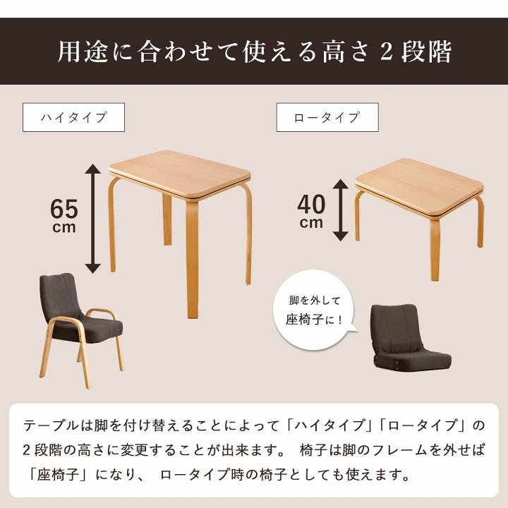 掛け布団とこたつ台、2WAYチェアのお得な3点セットです。脚を付け替えることによってハイタイプ・ロータイプへ変更できます。椅子も脚を外すと座椅子になります。こたつ台は、和室にも洋室にもあわせやすいシンプルデザイン。中間電源スイッチやコードフック等、あると便利な機能付き。ヒーター部分は、安心の国内メーカーメトロ製です。
