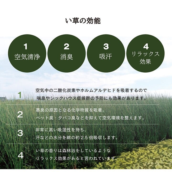 表地=い草 裏地=不織布(滑り止め加工)中材=木製ボード+ポリエチレン 中国