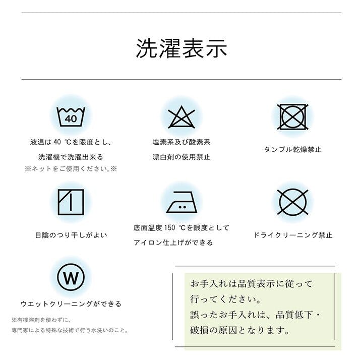 液温は40℃を限度とし、洗濯機で洗濯ができる(洗濯時は洗濯ネットをご使用ください。)干し方=日陰のつり干しがよい。
