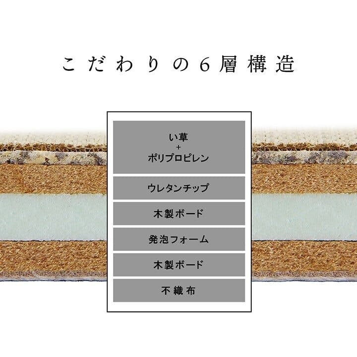 表地=い草+ポリプロピレン中材=ウレタンチップ5mm・木製ボード10mm・発泡ボード15mm・木製ボード10mm裏地=不織布 日本