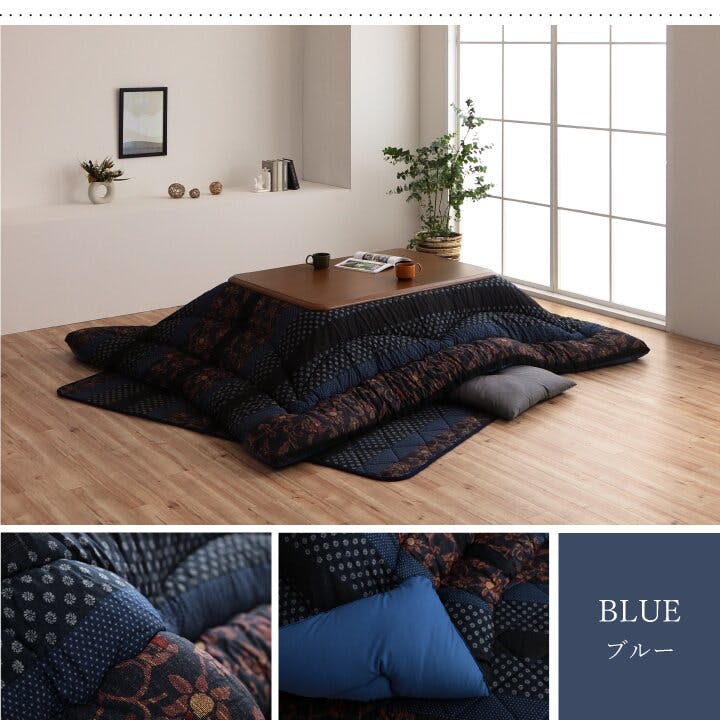 万葉 日本製 こたつ布団 こたつ厚掛敷布団 セット 和柄 長方形 大判 ブルー 約205×285cm 節電アイテム 省エネ対策 暖房節約 4956642207504【別送品】