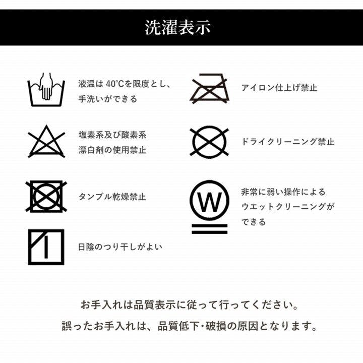 40℃以下の水温で弱い手洗いで洗濯してください。(洗濯機は使用できません。) 干し方=日陰のつり干しがよい。