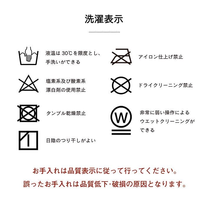 30℃以下の水温で弱い手洗いで洗濯してください。(洗濯機は使用できません。) 干し方=日陰のつり干しがよい。