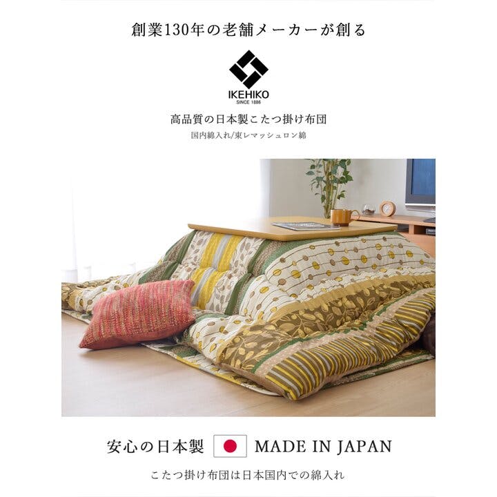 表地=ポリエステル100%【ピーチスキン】 裏地=ポリエステル100%【フランネル】 中綿=ポリエステル100% 2.2kg(東レ マッシュロンわた) 日本(側地=中国 最終加工=日本)