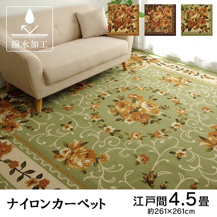 撥水キャンベル ナイロン 花柄 カーペット 撥水 速乾 グリーン 江戸間4.5畳(約261×261cm) 防音対策【別送品】