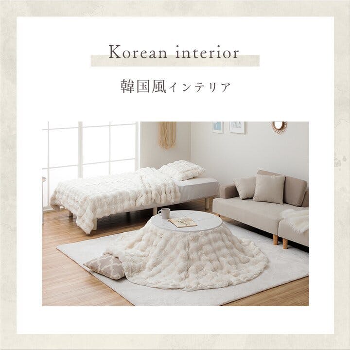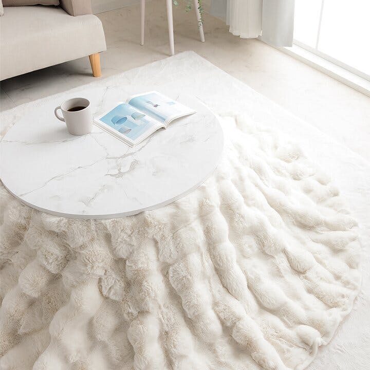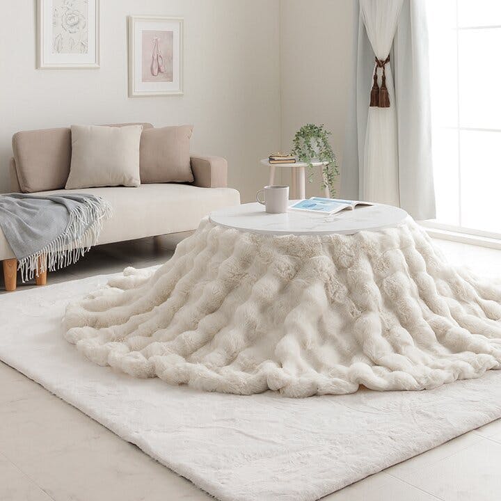”大人かわいい”シンプルデザインのラピアスシリーズに、プレミアムな触り心地のこたつ掛毛布が登場。もこもことしたシルエットが可愛い、ラビットファー調のこたつ掛け毛布です。当商品の生地を選定するにあたり、担当者が数種類の生地を実際に触り比べ、プレミアムの名に相応しい触り心地の生地を追及しました。極細のフィラメント糸で、とろけるような触り心地です。毛足の長さは25mmを採用しているので、一般的な
