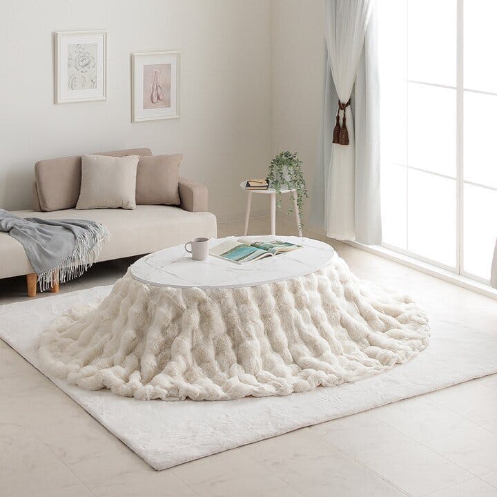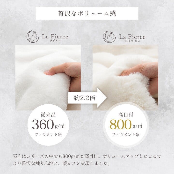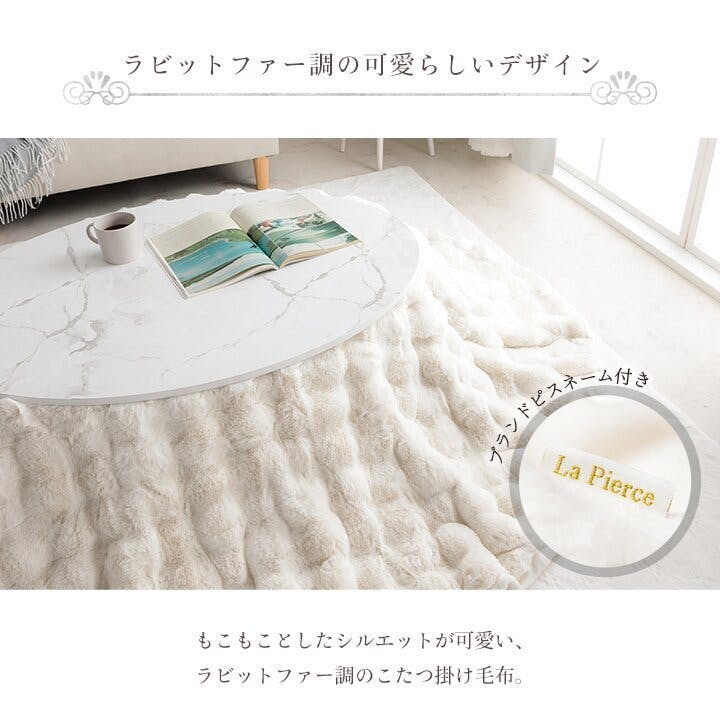 ”大人かわいい”シンプルデザインのラピアスシリーズに、プレミアムな触り心地のこたつ掛毛布が登場。もこもことしたシルエットが可愛い、ラビットファー調のこたつ掛け毛布です。当商品の生地を選定するにあたり、担当者が数種類の生地を実際に触り比べ、プレミアムの名に相応しい触り心地の生地を追及しました。極細のフィラメント糸で、とろけるような触り心地です。毛足の長さは25mmを採用しているので、一般的な