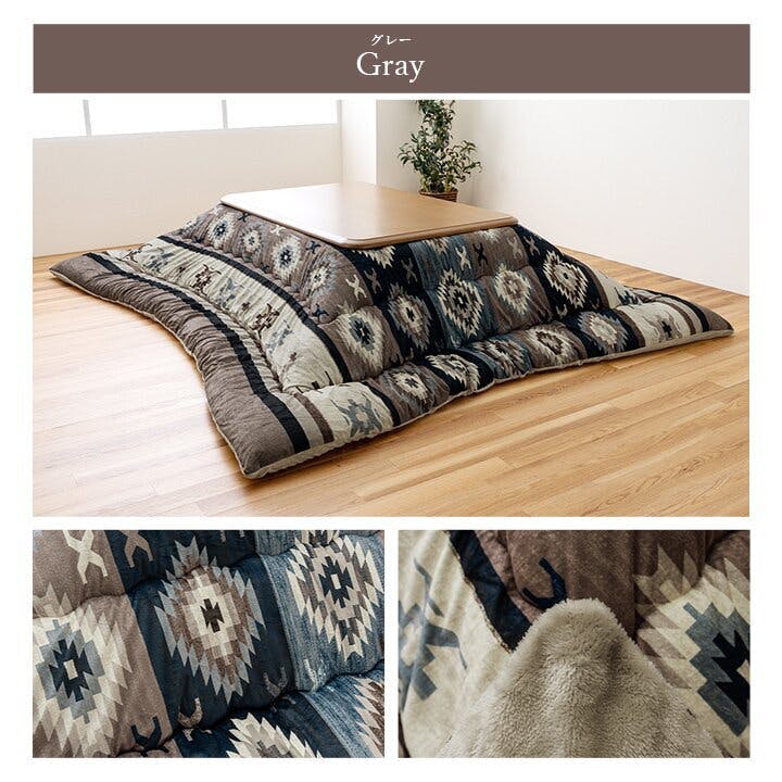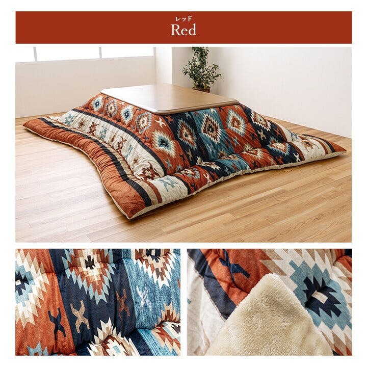 華やかなデザインのキリム柄のこたつ布団です。表地には肌触りの良い短毛マイクロファイバーを使用し、ふかふかの触り心地です。裏地はフランネル生地で暖かいです。国内で綿入れ加工をしているので、ふっくらとしたボリューム感のある仕上がりです。環境にやさしいマッシュロンの中綿を使用しています。軽量ですがボリューム感のある保温性の高い綿になります。