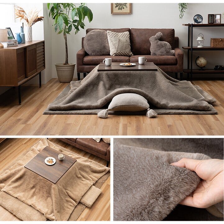 「ふかふかの上質な手触り、風合いが織りなす暖かく満たされた楽しい時間をあなたへ」をコンセプトとしたファンファーシリーズのこたつ布団です。表地はふわふわとした極上の手触りのフェイクファー生地です。MIXパイルで高級感のある仕上がりです。ボリュームがあり、触れた時にふんわりあたたかいです。裏面のフランネル生地はなめらかで、ずっと触れていたくなる肌触りです。表側にはキルトがないので、シルエット