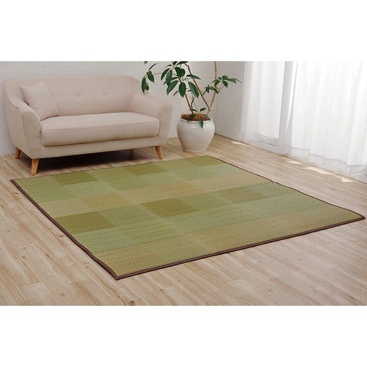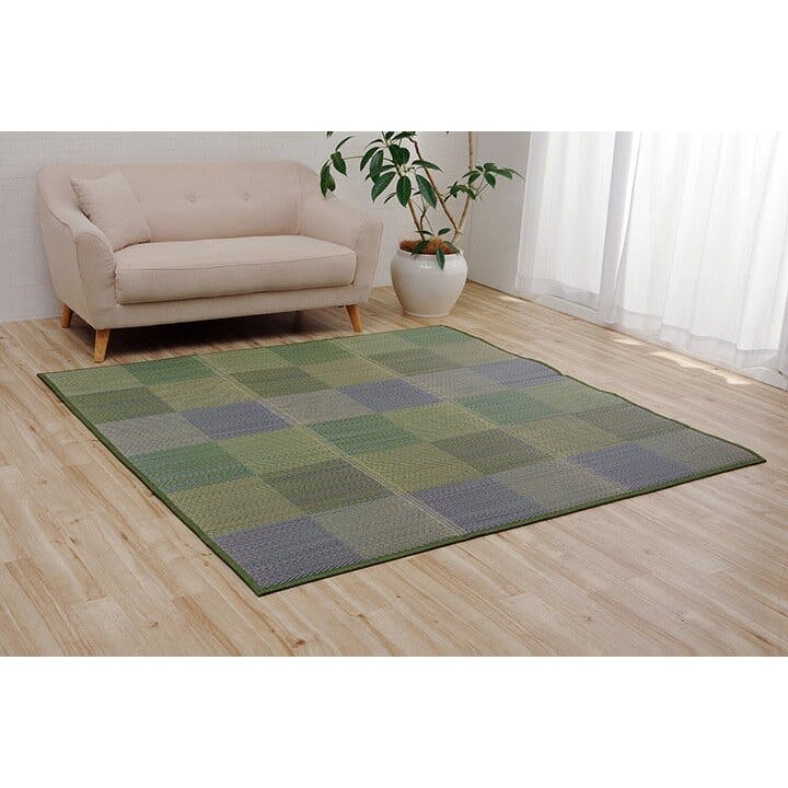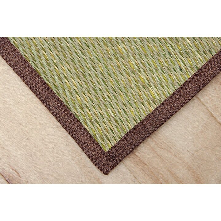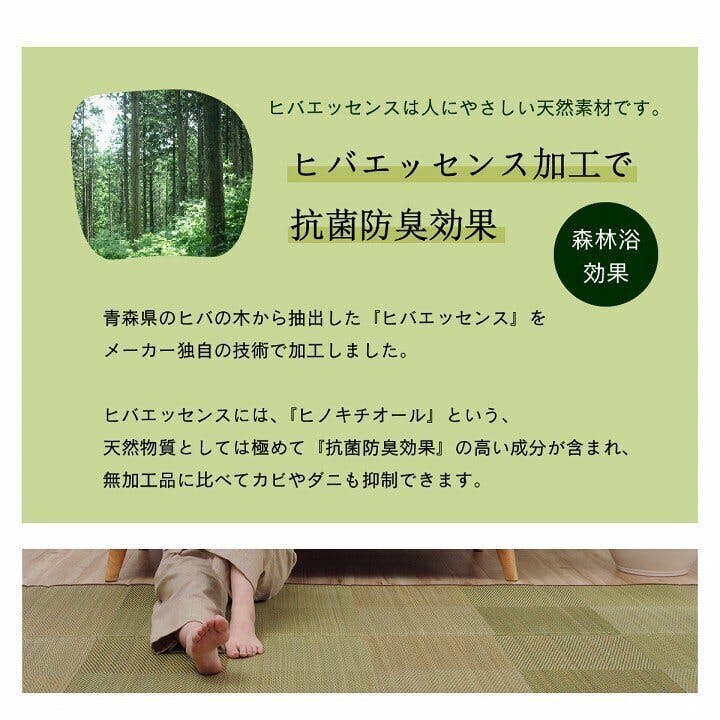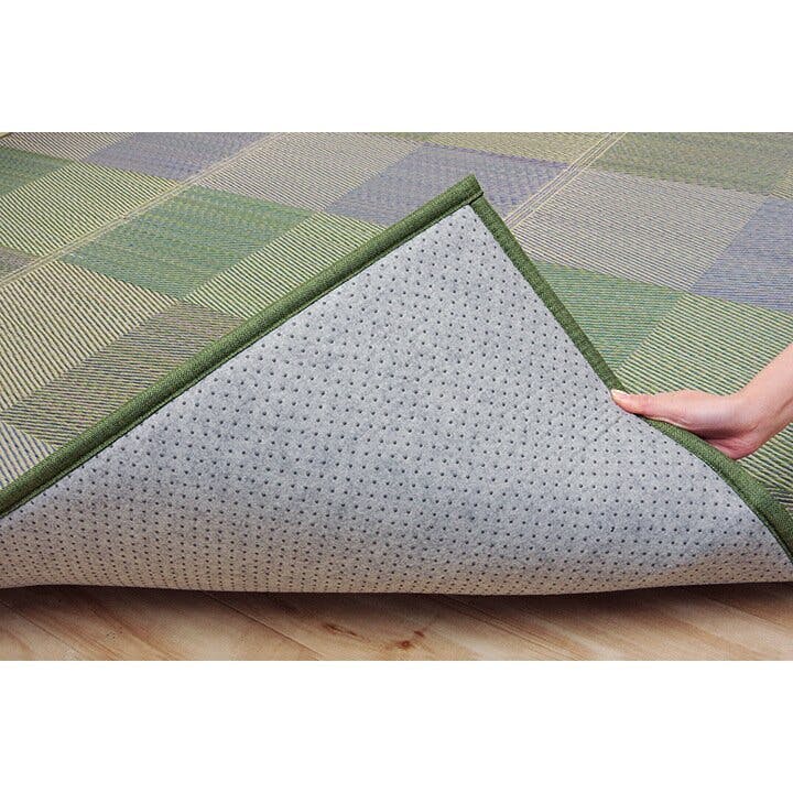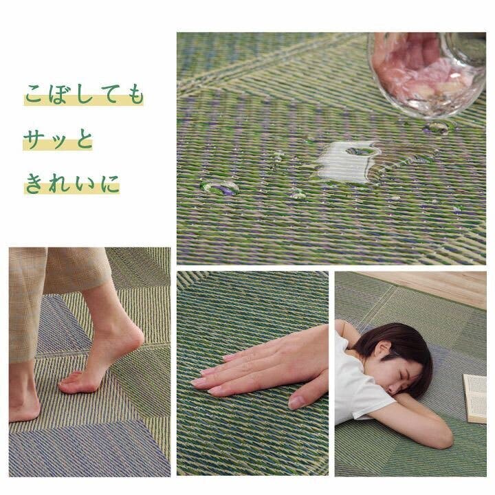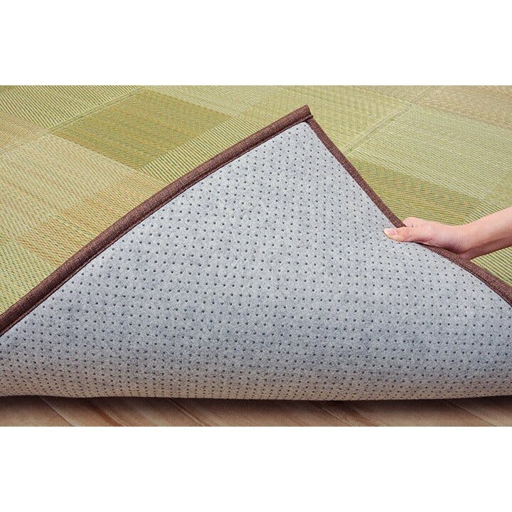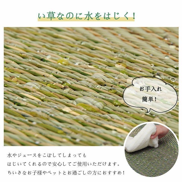 表地には撥水加工を施し、少しこぼしてしまっても、サッと拭き取って清潔にご使用できます。小さなお子様やペットのいるご家庭にオススメです。裏地には防ダニ加工を施しており、より安心してご使用いただけるよう工夫しております。中材にはウレタン8mmを使用し、底つき感のないふっくらない草ラグです裏は滑り止め不織布付きで、滑る心配がありません。い草には空気の自然浄化作用、湿度の調節作用などがあります。