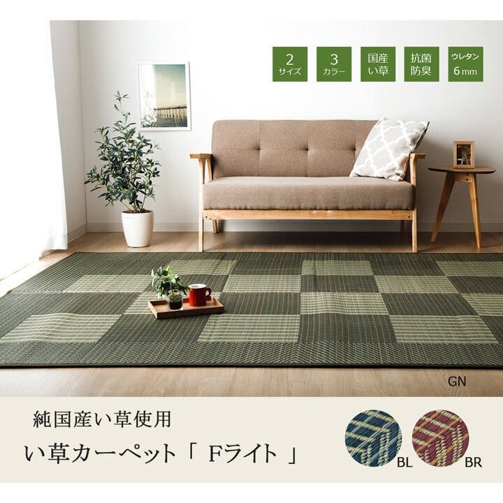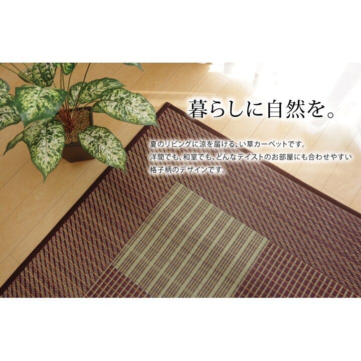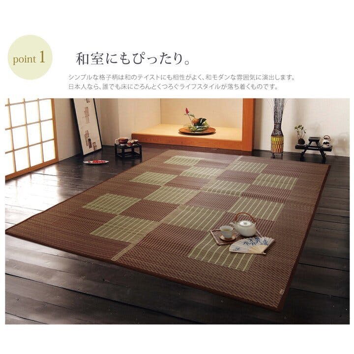 シンプルで飽きのこない格子柄のい草カーペットです。国産(九州産)のい草を使用しています。一本一本が太く、表皮が厚く繊維がキメ細かいので弾力性があり、耐久性に優れています。い草には空気の自然浄化作用、湿度の調節作用などがあります。また汚れにくく、使用するうちに黄金色に変化し味が出ます。裏にはウレタンを貼っていますのでフローリングでのご使用にも適しています。い草に青森ヒバ加工を施しています。(抗菌、防