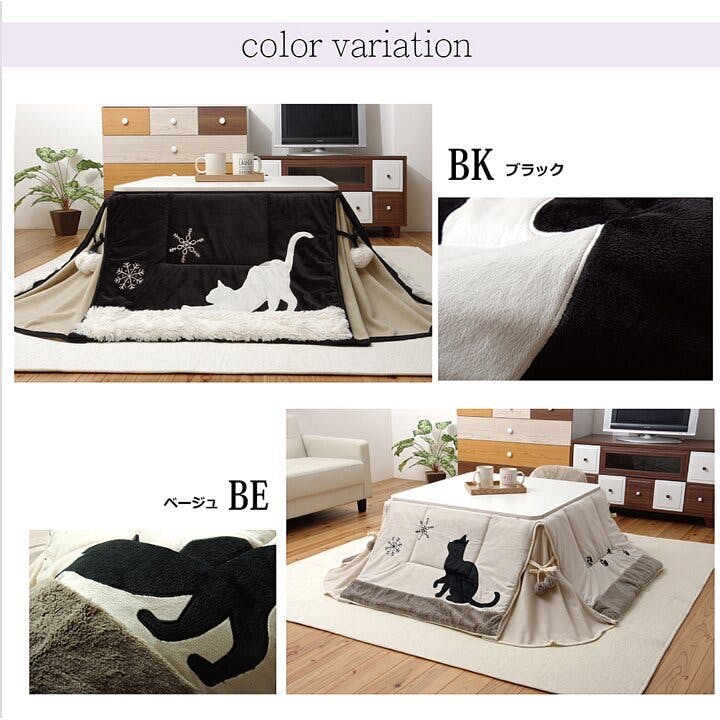 人気のネコ柄のコタツ布団です。ネコの柄をシルエット調にし、雪の結晶はプリントではなく、刺繍で表現することで、甘くなりすぎず、シックな雰囲気に仕上げました。表地には耐久性に優れ、しっとりとやわらかな短毛のマイクロファイバー生地を使用しています。裏地には軽くて保温性の高いフリースを使用しています。省スペースタイプで角が膨らまず、お部屋を広く使えます。薄手なので折りたたんでもかさばらず、コンパクトに収納