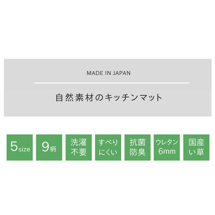 い草のキッチンマットです。キッチンマットの不満を解消してくれる商品です。化繊もののキッチンマットと比べ、汚れにくくシミになりにくいです。小さなゴミでも、ほうきで掃く、掃除機をかけるだけで取り除くことができます。い草自体が持つ油分により汚れを弾くので洗う必要がなく長くご使用いただけます。裏地には国産のウレタンフォームを使用することで,丈夫でクッション性があり滑りにくくしました。