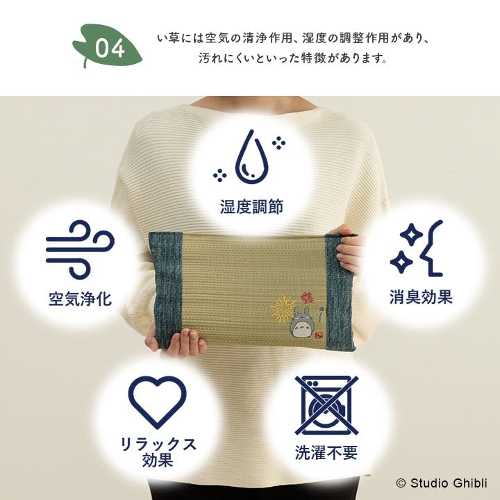 ■ スタジオジブリの人気キャラクター「となりのトトロ」のい草のミニ枕です。■ 中材は通気性のよいポリエチレンパイプを使用しています。パイプのため通気性がよく、熱がこもりにくいのが特長です。■ い草には空気の浄化作用、湿度の調節作用があり、汚れにくいといった特徴があります。