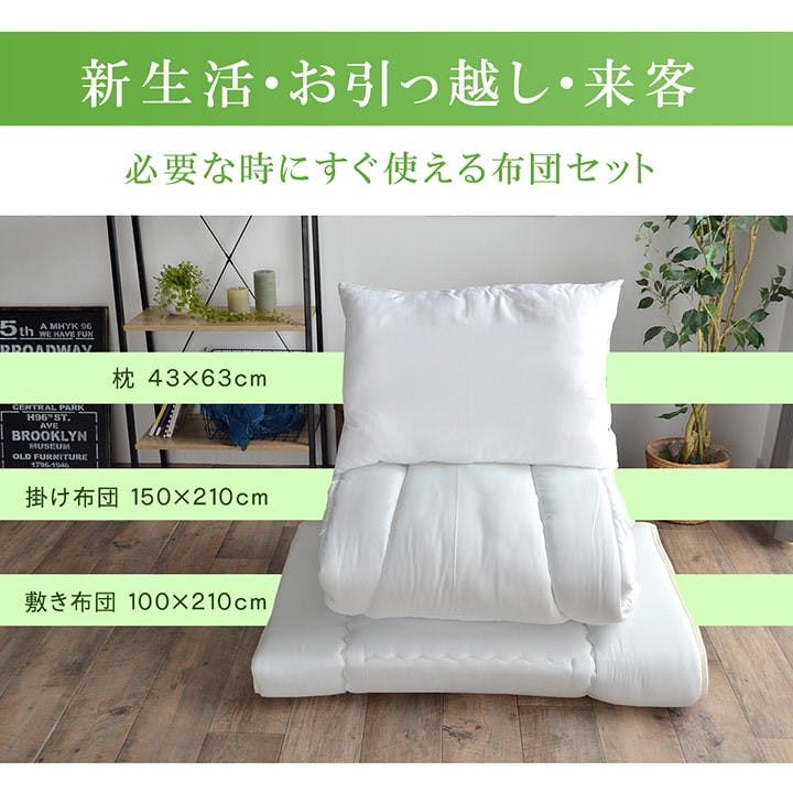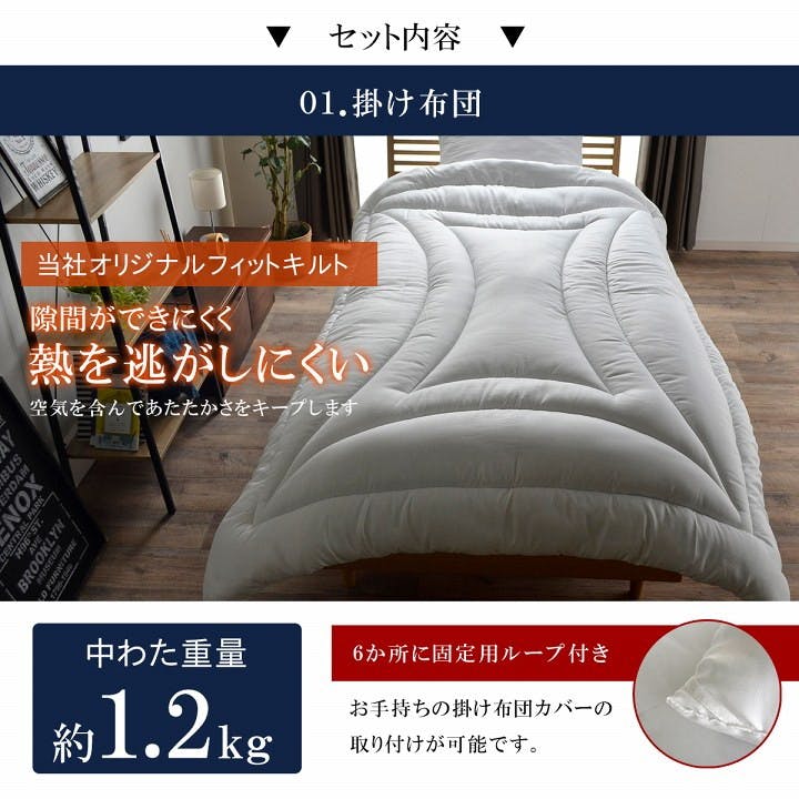 側生地=ポリエステル100% 掛中綿=ポリエステル100%(フィルハーモニー)1.5kg 敷中綿=巻綿 ポリエステル100% 2.7kg 固綿40mm (フィルハーモニー) 枕=ポリエステル100% 0.4kg 原産国:日本製