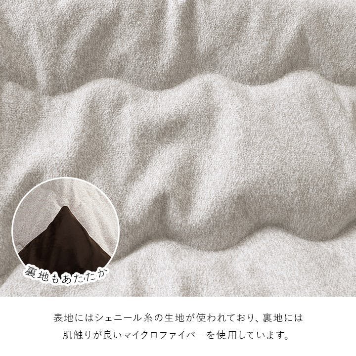 表地=ポリエステル100%(シェニール)中綿=ポリエステル100%裏地=ポリエステル100%(マイクロファイバー) 原産国:日本製(側=中国、最終加工=日本)