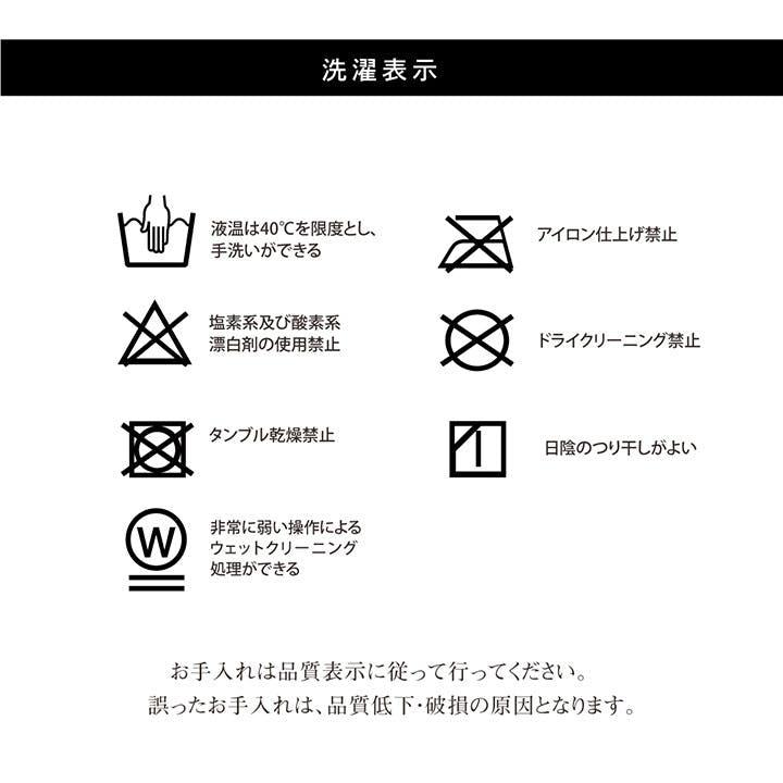40℃以下の水温で弱い手洗いで洗濯してください。(洗濯機は使用できません。) 干し方=日陰のつり干しがよい。