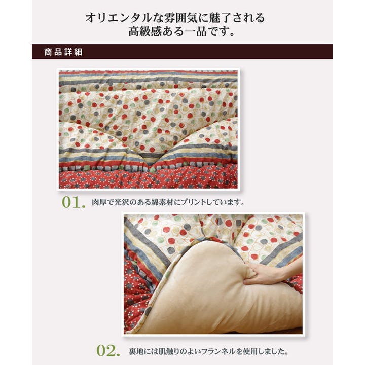表地=綿100% 裏地=ポリエステル100%【フランネル】 中材=ポリエステル100% 2.7kg 原産国:日本製
