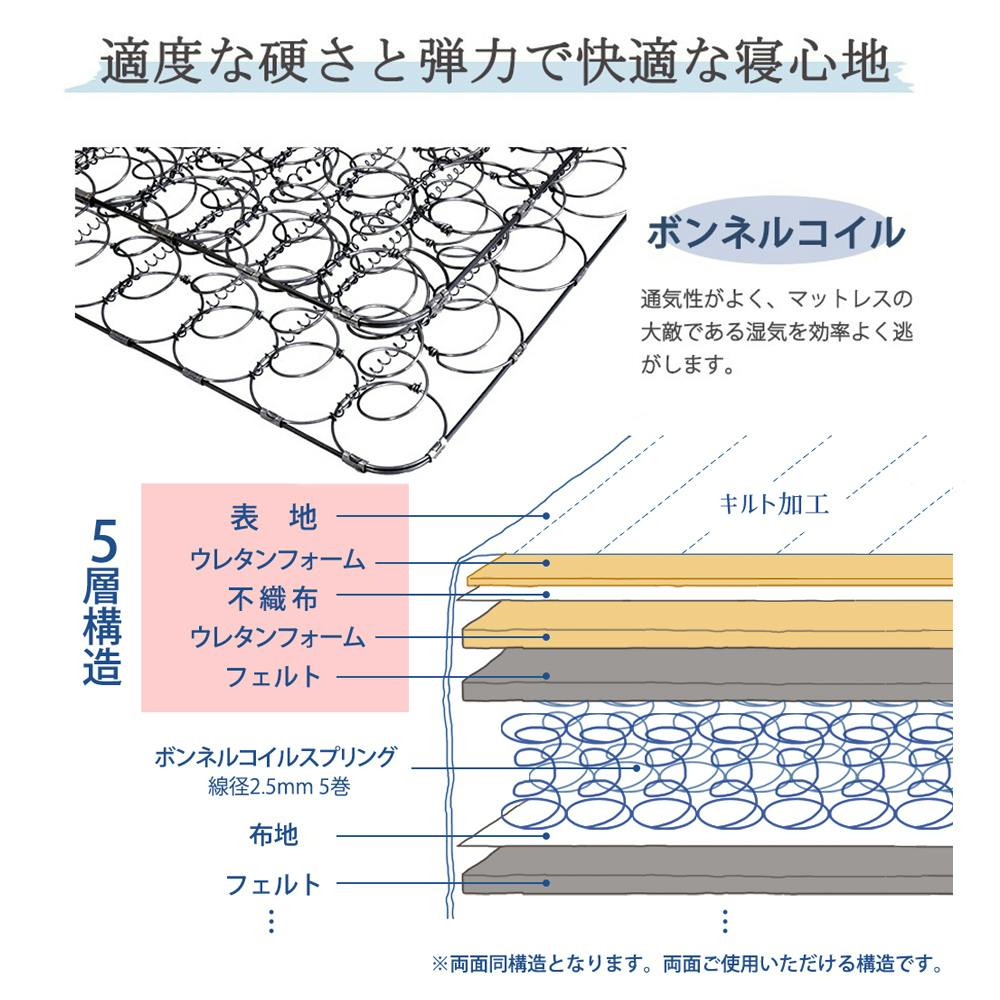 フレーム主材:プリント化粧板 マットレス主材/2.5mmボンネルコイルスプリング(コイル数/S:216)、ウレタン、フェルト、ポリエステルフレーム:日本製 マットレス:中国製