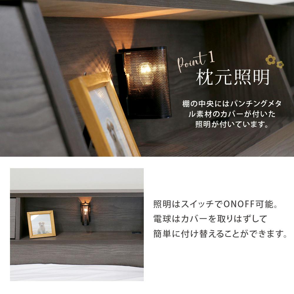 友澤木工 棚 照明 コンセント フラップテーブル 引出し付ベッド アッシュブラウン ダブル ボンネルコイルマットレス 通気性抜群 ライト ベッド 収納 マット付き 宮付き ベット K333-89-D(108165) 【別送品】