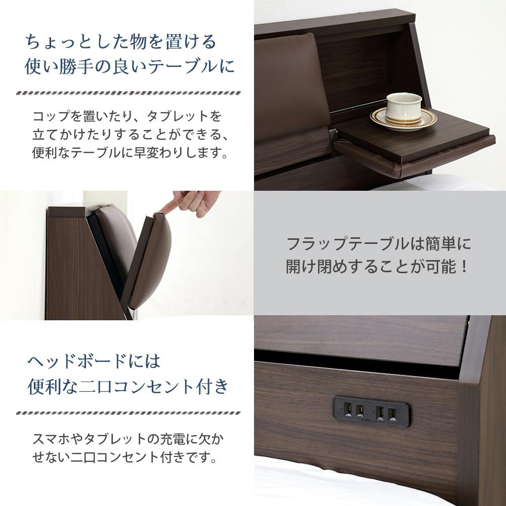 ■クッション付きのヘッドキャビネットにもたれてゆったりとした時間が過ごせるベッドです。■ヘッドキャビネットに3分割のクッションシートを備え、通常時は背もたれとしてご使用いただけます。■シートを開ければ小振りなテーブルとしてお使いいただけます。■高級感のあるダークブラウン色■安心安全の日本製