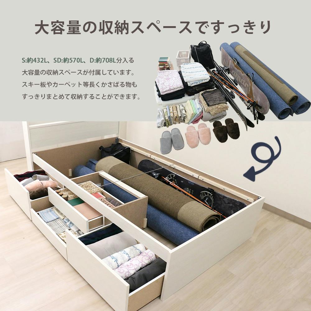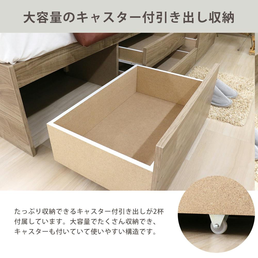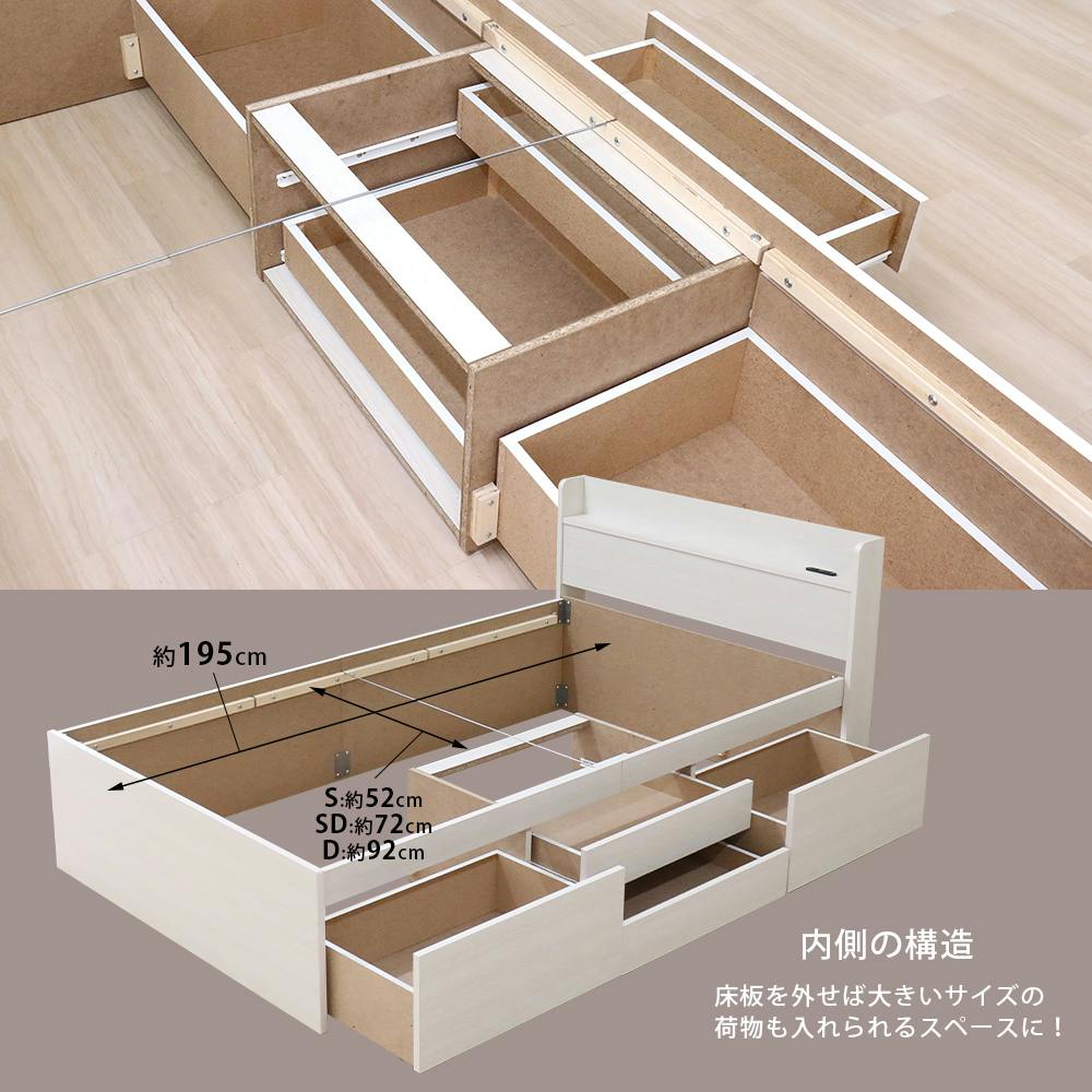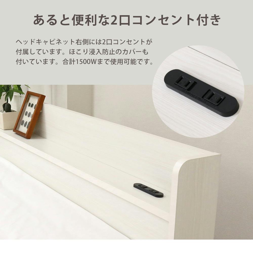 ■たっぷり入る引出収納が計4杯付いた多機能ベッドです。■ヘッドキャビネットにはスマホの充電に便利な2口コンセントが付いています。■床板を外せばかさばる長物も収納できて便利です。