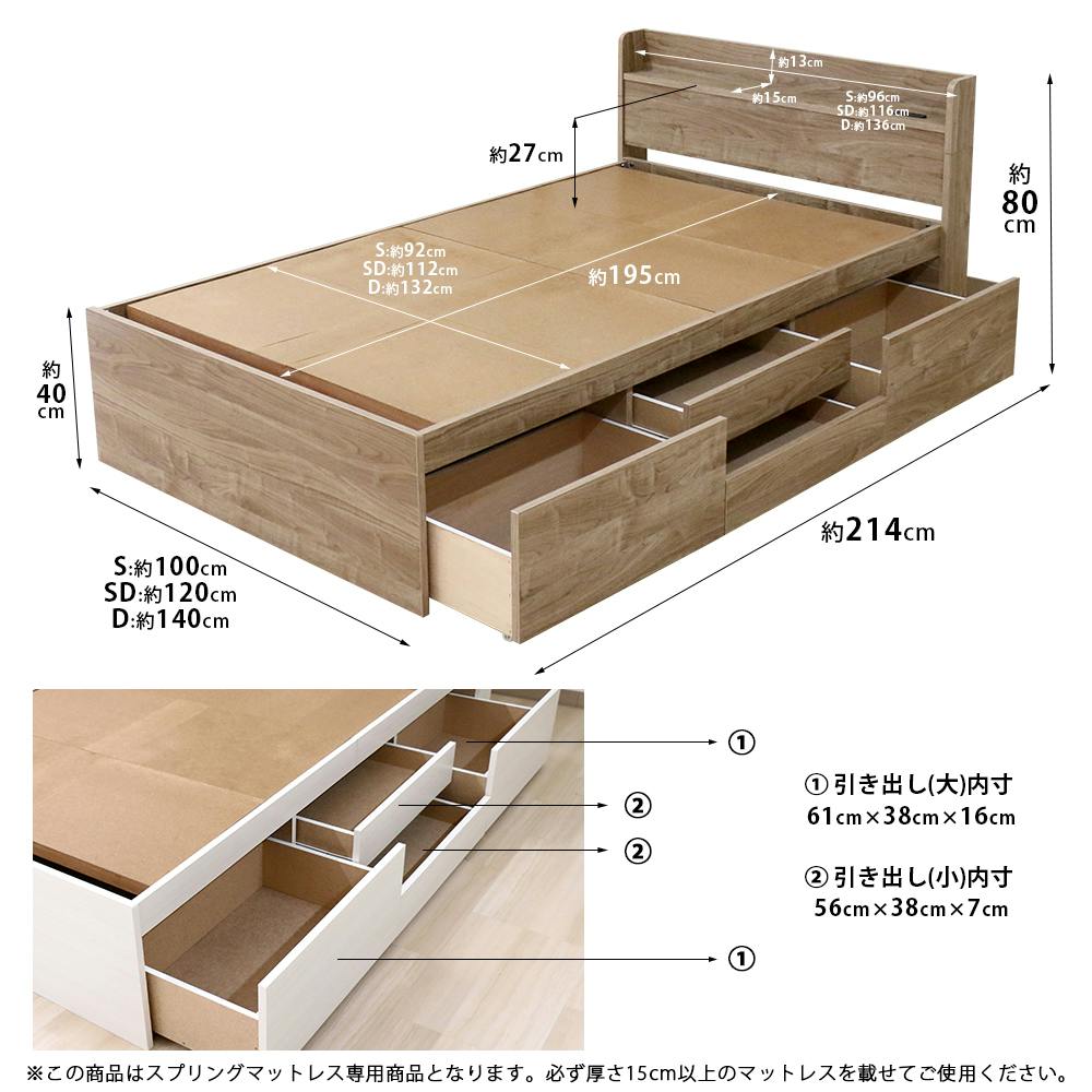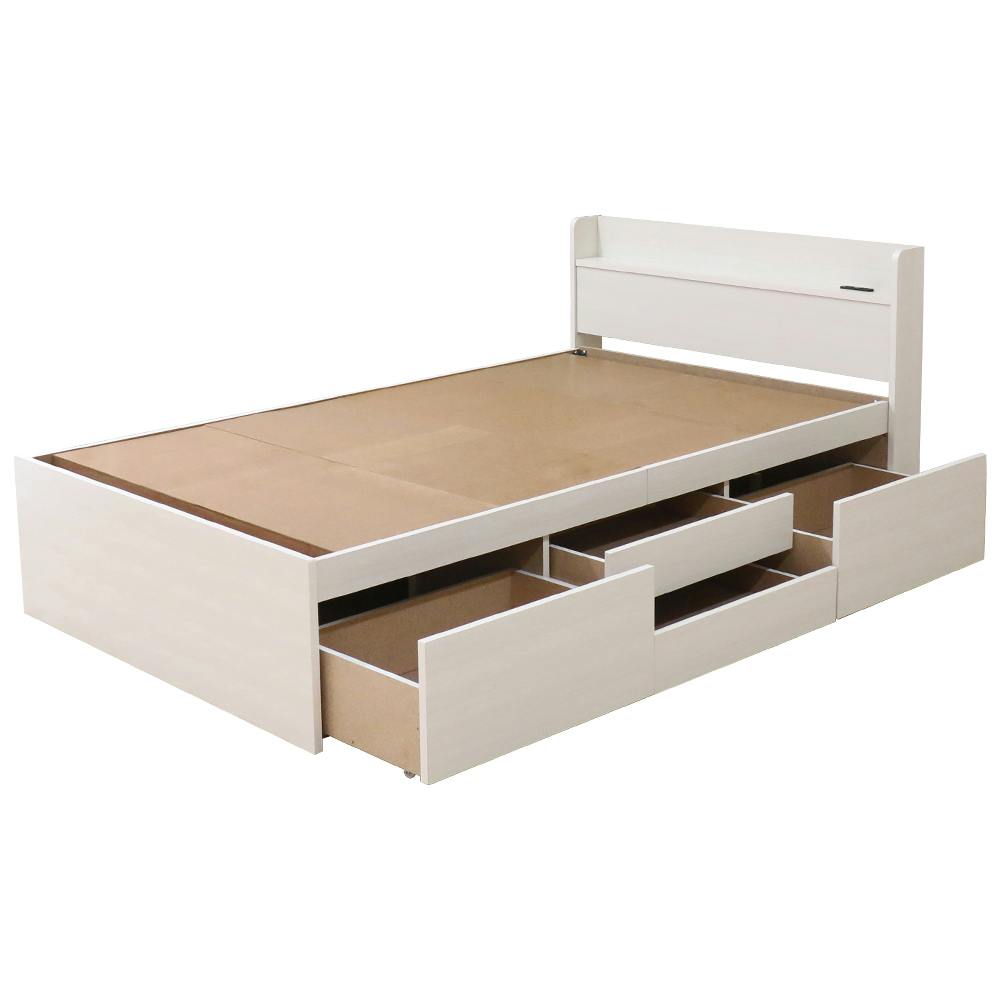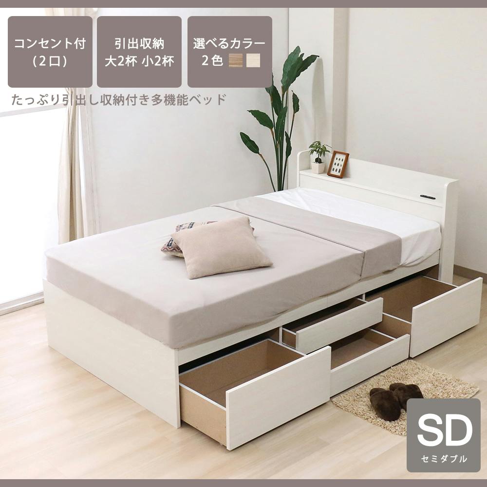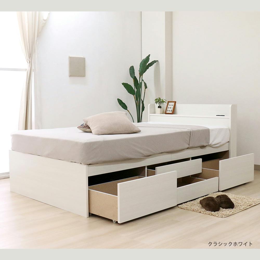 ■たっぷり入る引出収納が計4杯付いた多機能ベッドです。■ヘッドキャビネットにはスマホの充電に便利な2口コンセントが付いています。■床板を外せばかさばる長物も収納できて便利です。