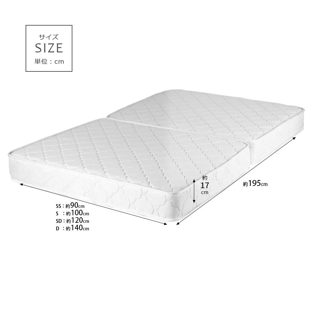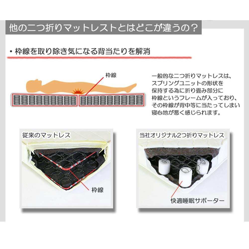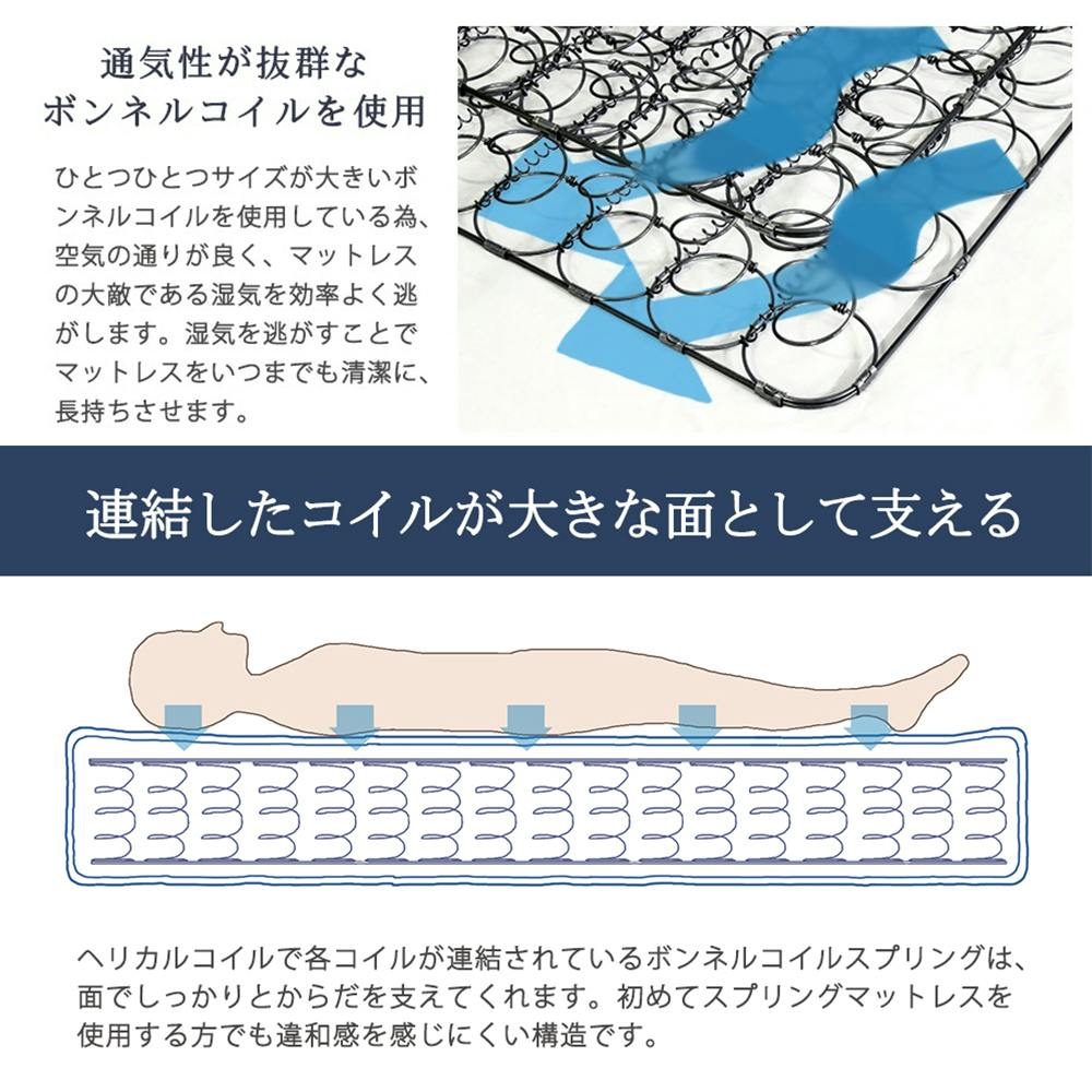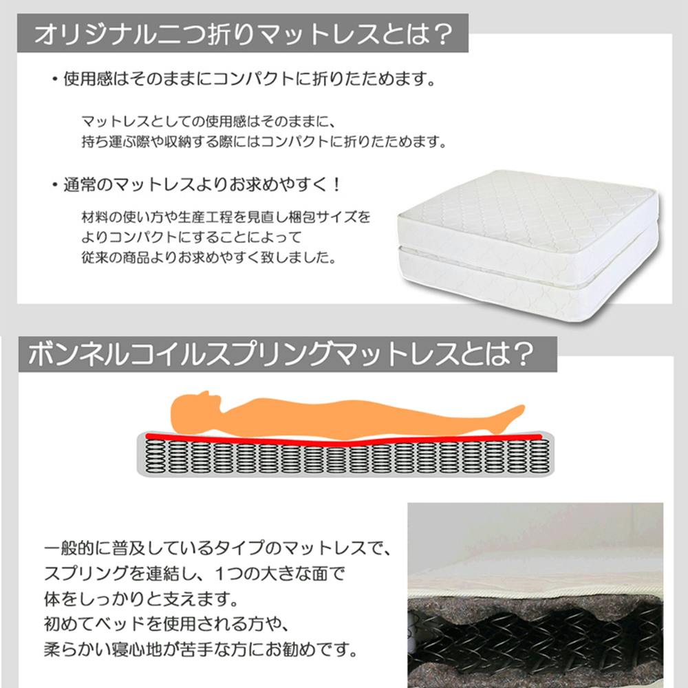 ■2つ折りにできる、コンパクトなボンネルコイルマットレスです。■持ち運びに便利!■通気性がよく、身体を面でしっかり支えます。■ボンネルコイル同士が連結されているので、加重を面全体で受け止める構造をしています。■マット全体の反発と程よい硬さで、しっかりとした寝心地です。