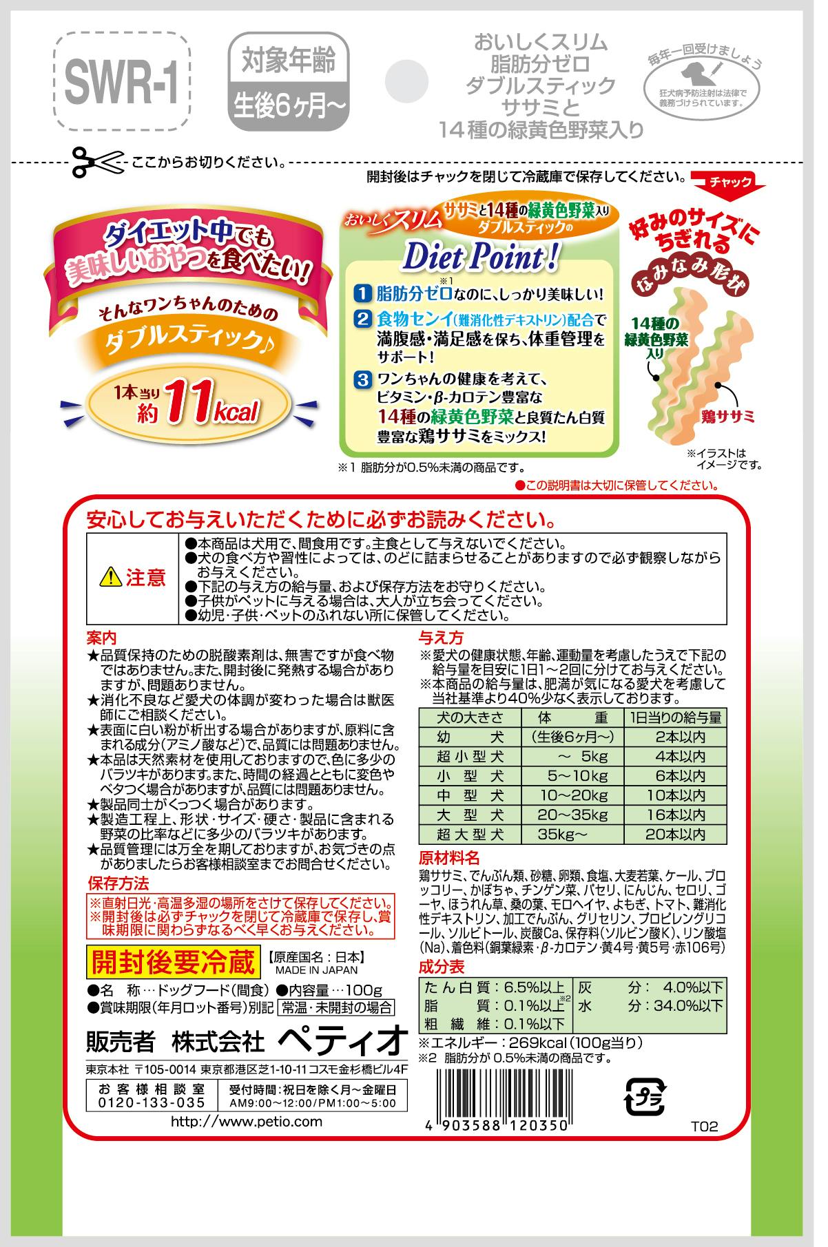 • おいしくスリム 脂肪分ゼロ ダブルスティック ササミと14種の緑黄色野菜入り100g ダイエット 高タンパク 体重管理 3413937001【別送品】