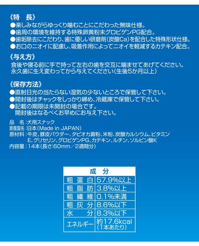 牛皮、豚皮パウダー、タピオカ澱粉、米粉、炭酸カルシウム、ビタミンE、グリセリン、グロビゲンPG、カテキン、ルチン、ソルビン酸K