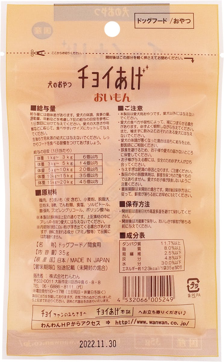 鶏肉、さつまいも、小麦粉、大豆たん白、砂糖、食塩、でん粉、ソルビトール、膨張剤、プロピレングリコール、ポリリン酸Na