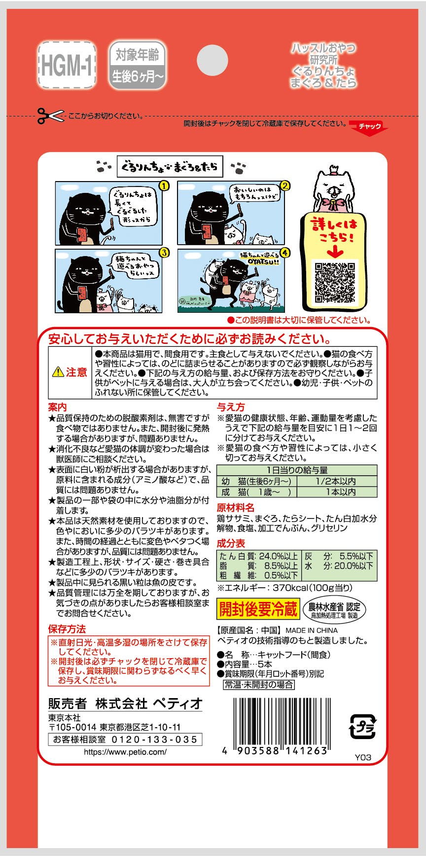 ハッスルおやつ研究所Catぐるりんちょまぐろ&たら5本 香ばし風味 ささみ ささみジャーキー 3418782001【別送品】