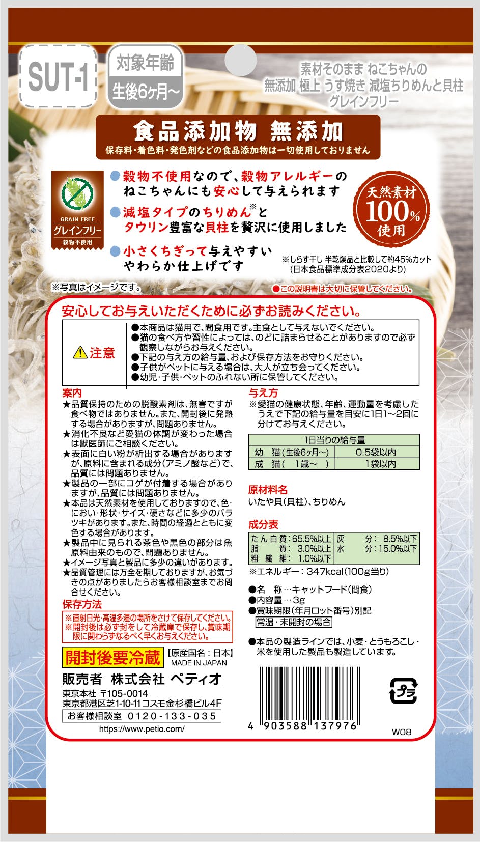 素材そのまま ねこちゃんの 無添加極上うす焼き 減塩ちりめんと貝柱3g 猫玩具 つめみがき 両面使える 3418278001【別送品】