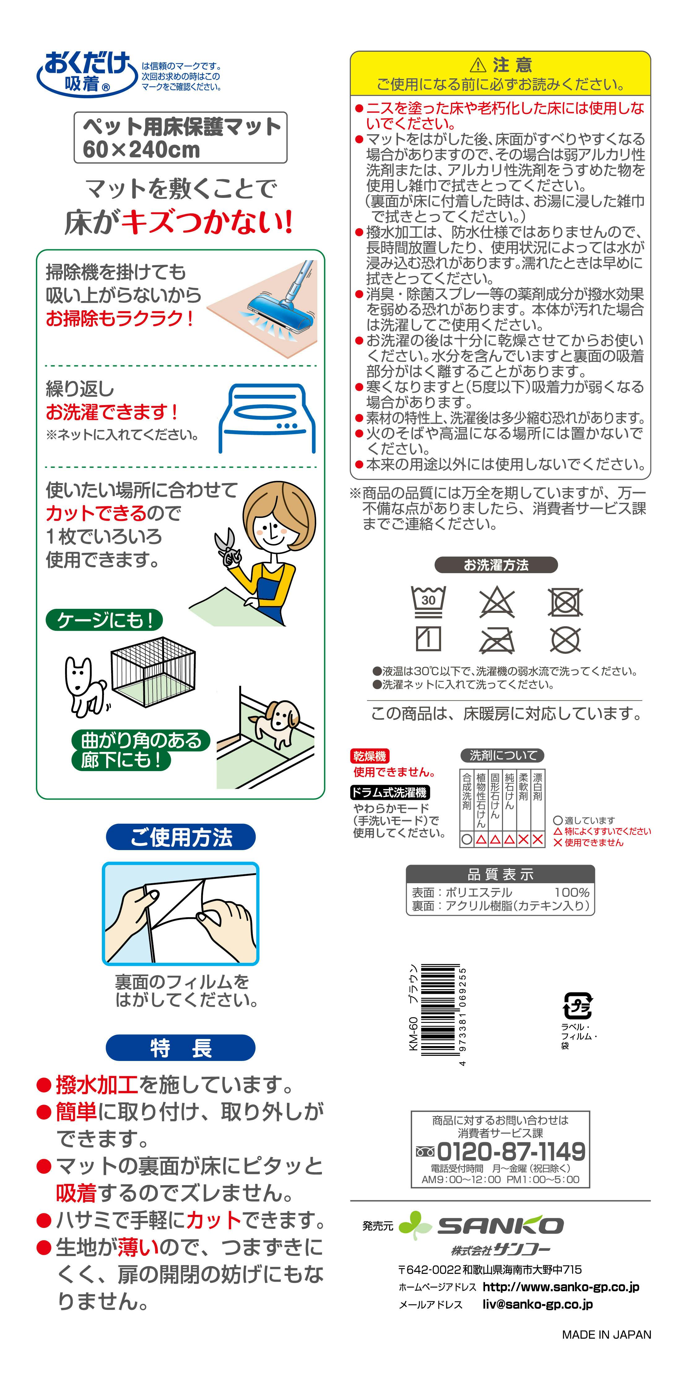 サンコー おくだけ吸着 ペット用床保護マット 60×240cmBR 4973381069255【別送品】