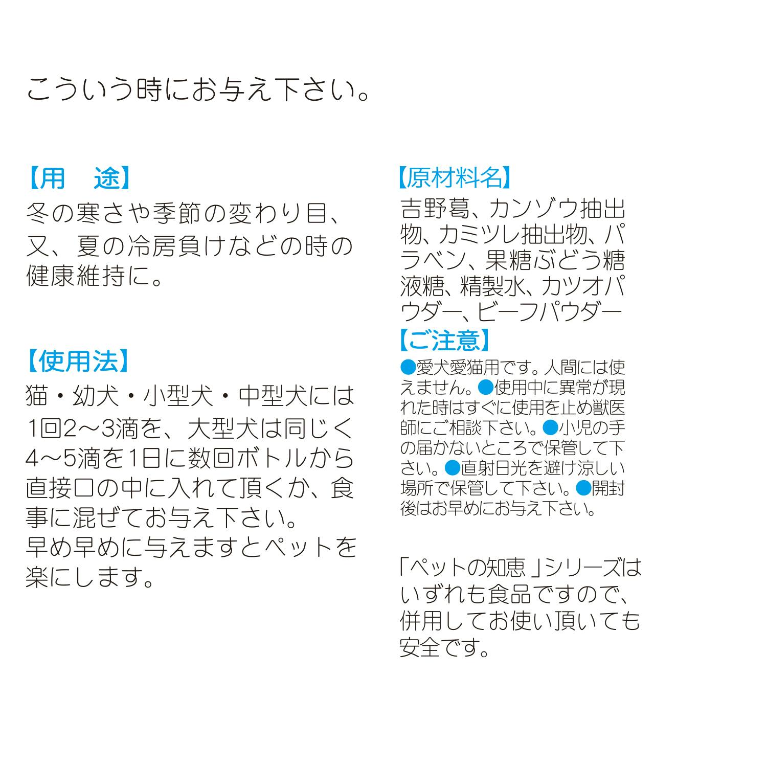 いつもの元気がない時や、寒さ負けなどの風邪気味の時に与えてください