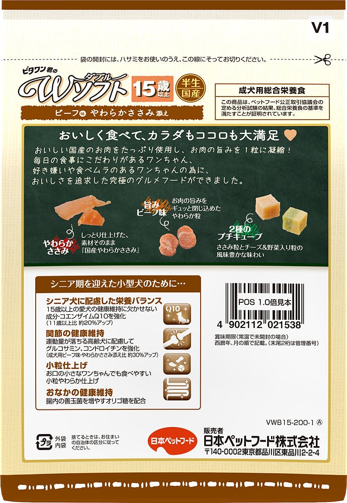 ビタワン君 日本ペットフード のWソフト 15歳以上 ビーフ味・やわらかささみ添え 200g シニア 国産 半生 1011196001【別送品】