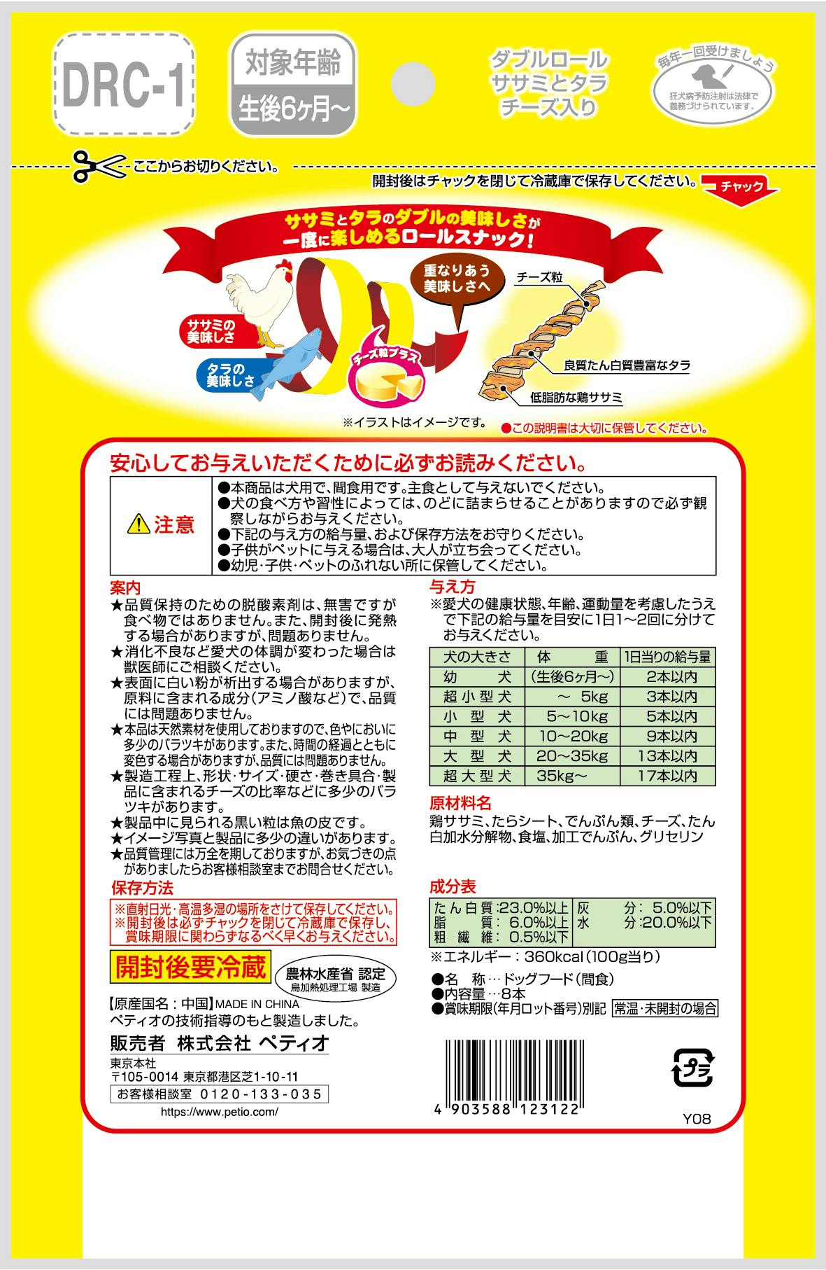 ペティオ ダブルロール ササミとタラチーズ入り 8本 犬おやつ 噛み応え ささみ 3415157001【別送品】