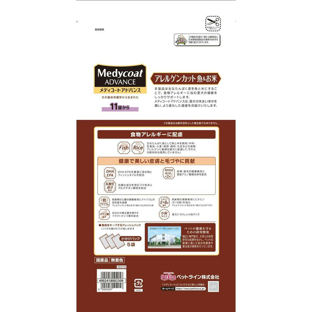 【ケース販売】ペットライン メディコートアドバンス アレルゲンカット 魚&お米 11歳から 500g×5袋(1ケース4個入り) シニア アレルゲン対応 ドライフード 1041101004【別送品】