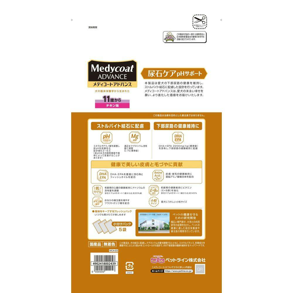 【ケース販売】ペットライン メディコートアドバンス 尿石ケアpHサポート 11歳から チキン味 500g×5袋(1ケース4個入り) シニア 下部尿路 ドライフード 1041105004【別送品】