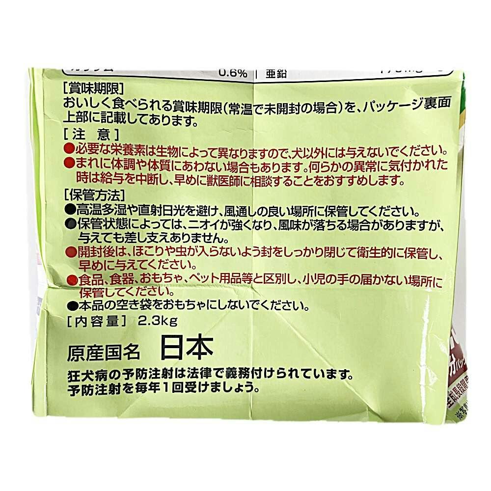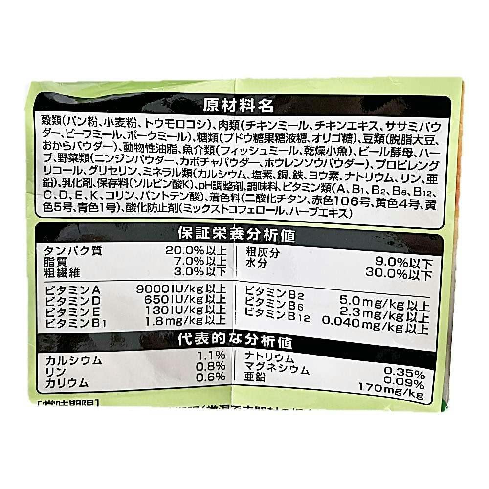 たんぱく質20.0%以上、脂質7.0%以上、粗繊維3.0%以下、灰分9.0%以下、水分30.0%以下