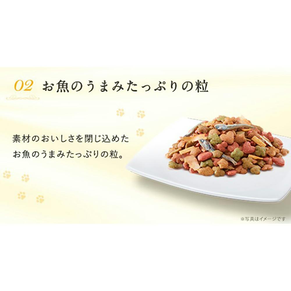穀類(トウモロコシ、コーングルテンミール、小麦粉、パン粉)、肉類(チキンミール、ポークミール、ビーフミール、チキンエキス)、動物性油脂、セルロースパウダー、魚介類(フィッシュエキス、乾燥小魚、フィッシュミール、かつお節、乾燥まぐろ加工品、煮干パウダー、かつおミール、まぐろミール、白身魚ミール)、野菜類(ビートパルプ、ニンジンパウダー、カボチャパウダー、ホウレンソウパウダー)、酵母エキス、ビール酵母、ミネラル類、アミノ酸類、ビタミン類、着色料、調味料、酸化防止剤