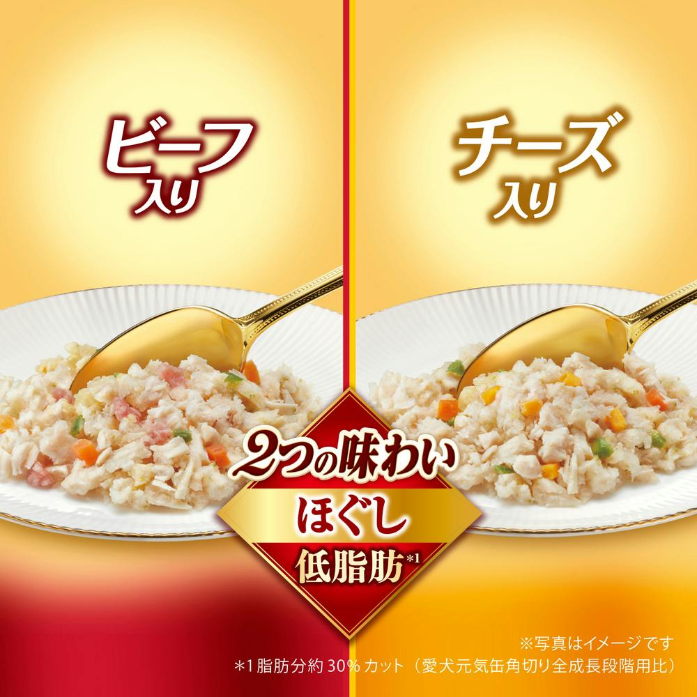 チーズ入り:肉類(鶏胸肉、ささみ)、野菜類(キャベツ、ニンジン、インゲン)、しょうゆ、チーズ、増粘多糖類、調味料、塩化カリウム、酸化防止剤(EDTA-Ca・Na)/ビーフ入り:肉類(鶏胸肉、ささみ)、野菜類(キャベツ、ニンジン、インゲン)、ビーフ・チキン加工肉、しょうゆ、増粘多糖類、調味料、塩化カリウム、酸化防止剤(EDTA-Ca・Na)