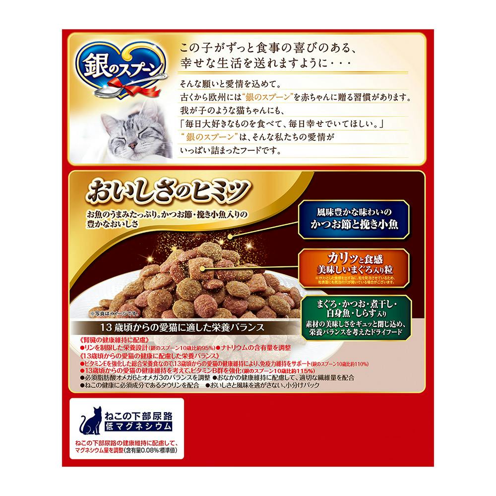 ●まぐろ・かつお・煮干し・白身魚・しらす味で素材の美味しさをギュッと閉じ込め、栄養バランスを考えたドライフード●風味豊かな味わいのかつお節と挽き小魚入り●カリッと食感、美味しいまぐろ入り粒入り●腎臓の健康維持に配慮