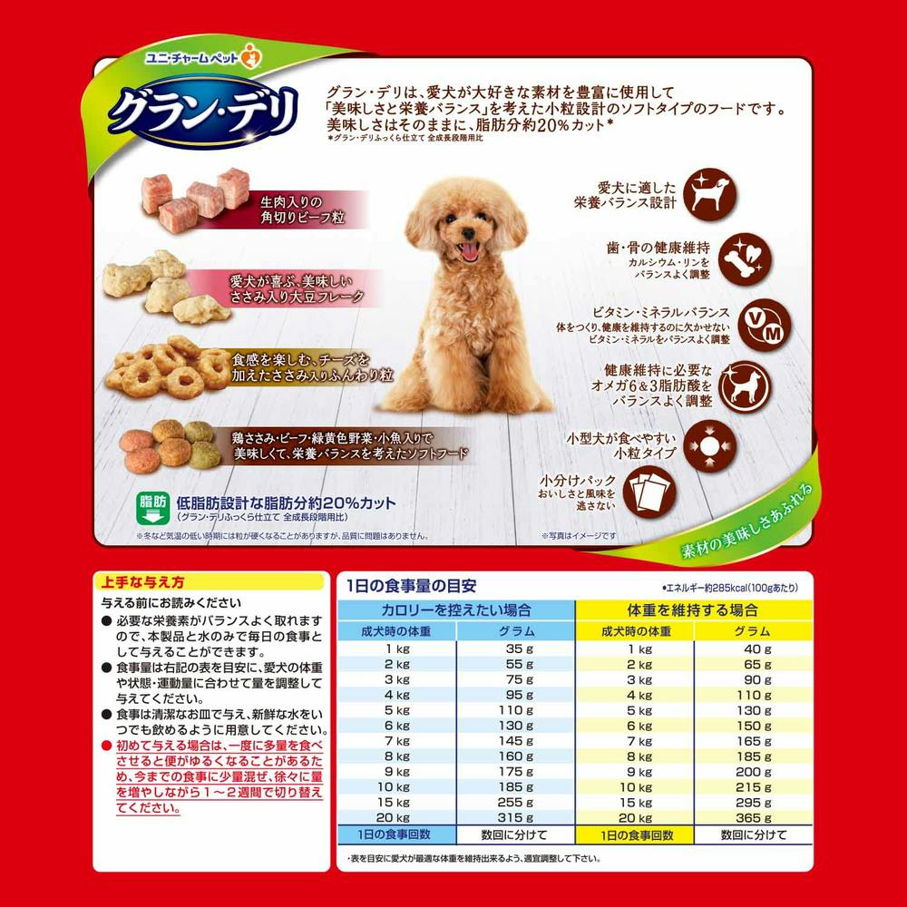 ●グラン・デリは、愛犬が大好きな素材を豊富に使用して「美味しさと栄養バランス」を考えた小粒設計のソフトタイプのフードです。美味しさはそのままに、脂肪分約20%カット